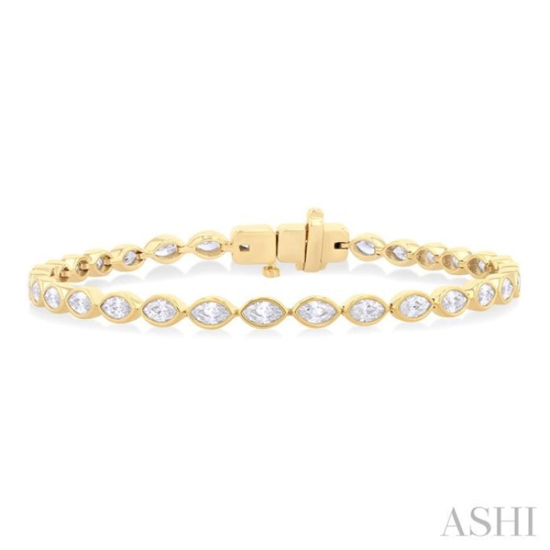 Perfect for adding a touch of glamour to any outfit, this diamond tennis bracelet is all about sparkle, style, and making a statement. It features a unique and eye-catching design with marquise-shaped links set in an east-west orientation, each one sparkling with a bezel set marquise cut diamond. With a total of 32 bezel set brilliant diamonds, this bracelet is sure to turn heads. crafted in 14 karat yellow gold, the diamond tennis bracelet exudes beauty and sophistication. It is secured with a push-release box clasp closure for easy handling and safety. Total diamond weight is 3 ctw.