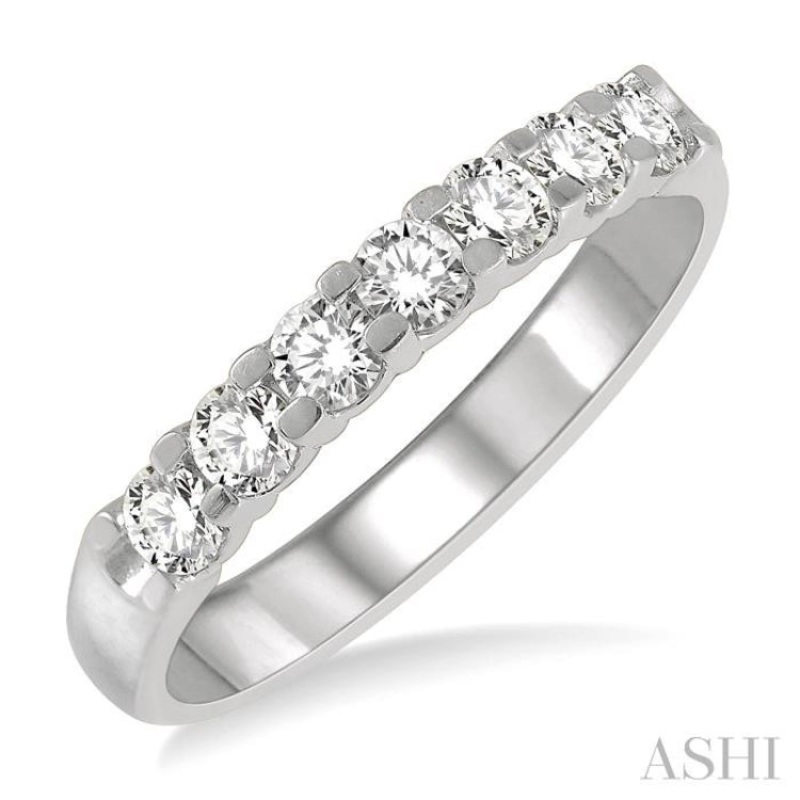 A lustrous 7 Stone diamond wedding band, this can add sparkle to her eyes in an instant. As the name implies, the wedding band is embellished with 7 diamonds, hence 7 Stone. There are 7 prong set round cut diamonds of 1/10 ctw each, lined in a neat row on