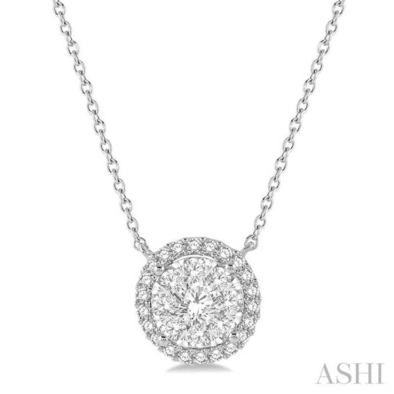 A pretty Lovebright diamond necklace, this makes a fine addition to one’s collection. It features a circular necklace that displays a center mount and a border around it. The center mount is embellished with an invisible set round cut diamond in the middle, haloed by 8 invisible set round cut diamonds. Adorning the border trim are 22 pave set round cut diamonds. An 18-inch CAT30 chain with a lobster lock completes the necklace. While the necklace is styled in 14-karat white gold. The total diamond weight is 3/4 ctw.