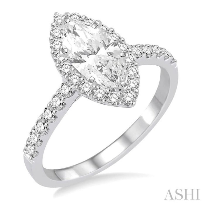 Commemorate your love in lavish elegance and style with this stunning diamond engagement ring. Styled in 14 karat lustrous white gold this ring showcases a 1/2 ct marquise cut diamond at the center. Brilliant 34 prong set round cut diamonds, beautifully encompasses the center in a marquise shape and embellishes the shank with sparkling a row of diamonds. Total diamond weight is 3/4 ctw.