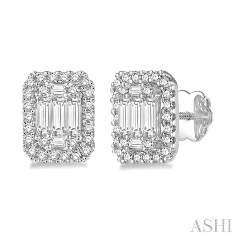 Beautiful stud earrings, these offer a visual appeal that is tempting, making you want to instantly include them to your personal jewelry collection. Studded with baguette and round cut diamonds, the octagonal shaped studs offer commendable craftsmanship and aesthetically attractive designing. 10 invisible set baguette diamonds, with 8 invisible set round cut diamonds on each corner of the baguette diamond setting, plus 44 pave set round cut diamonds along the border can be seen embellished on both earrings together. The studs are styled in 14 karat white gold. Total diamond weight is 3/4 ctw.