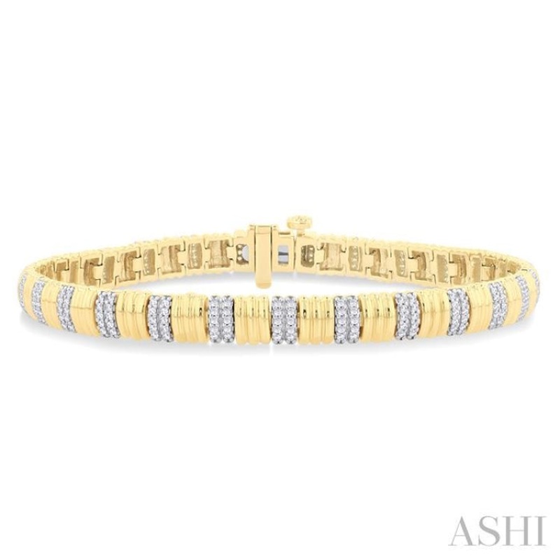 Add a touch of panache to your jewelry collection, with this distinctive diamond fashion bracelet. The eye-catching bracelet features an alternating pattern of twin-row diamond links and triple-row ribbed plain gold links, creating a stunning visual effect along its length. Each twin-row link is adorned with 10 prong set round cut diamonds, adding to a total of 270 diamonds across the 27 diamond twin-row links. These dazzling gems lie between the sleek, triple-ribbed gold links, making the bracelet a true statement piece. Secured with a push-release open box clasp, this diamond fashion bracelet is carved in 10 karat yellow gold. Total diamond weight is 3/4 ctw.