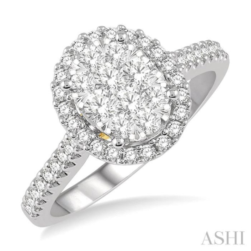 Thoughtfully designed for maximum brilliance, this modish engagement ring centers invisible set round diamonds in an oval shape prong set diamond halo. The diamonds on the shank and underneath the mounting further intensifies the brilliance, making this lattice Lovebright ring more electrifying. In 14 karat white and yellow gold, To spice up the matter, the detailed milgrain finish is finely polished in Yellow Gold. With 52 diamonds of fine quality, this halo diamond ring also makes a great anniversary gift. Total diamond weight is 3/4 Ctw.
