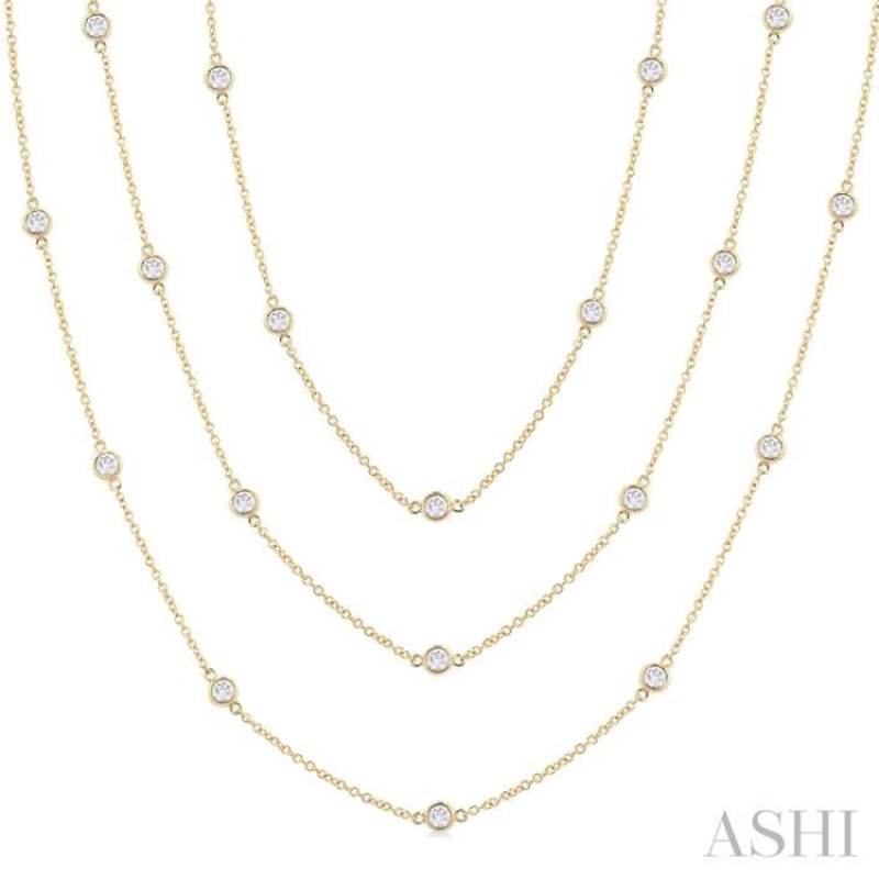 Indulge in luxury with this glamorous diamond long station necklace, which is a grand addition to your jewelry collection. Versatile and stylish, the necklace can be worn in multiple ways. Whether worn as a single long chain for a sleek and sophisticated look or twisted into layers for added volume and dimension, it effortlessly elevates any ensemble. The necklace features a stunning layout of 50 bezel set round cut diamonds adorning the stations of the 60-inch long Cat-30 Chain, creating an eye-catching effect. A polished finish 14 karat yellow gold body adds a touch of refinement and elegance. Total diamond weight is 3 ctw.