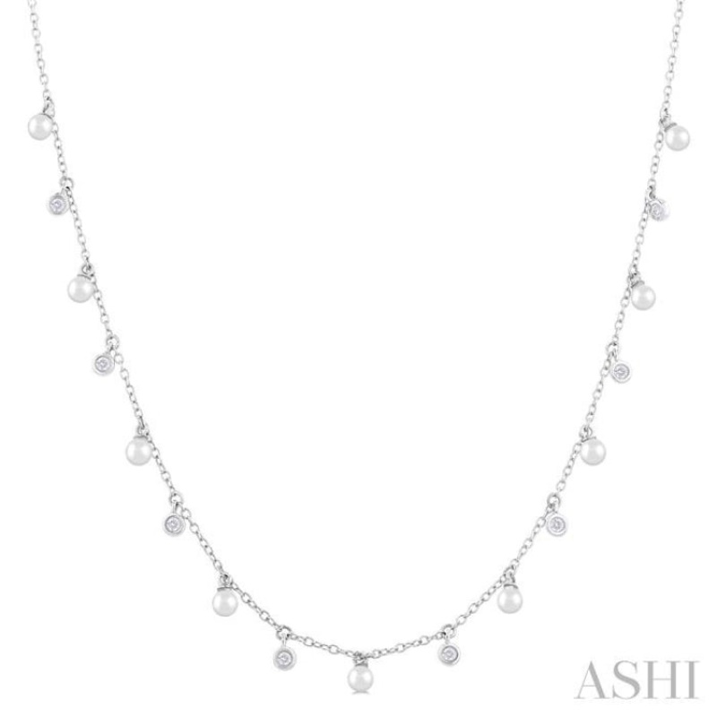 This cultured pearl and diamond station necklace is the perfect accessory to elevate any outfit, adding a touch of classic glamour to your look. The beautiful station necklace showcases a harmonious arrangement of round white cultured pearls and bezel set round cut diamonds, delicately placed at alternating intervals along the neckline. Featuring 9 lustrous cultured pearls and 8 sparkling diamonds, this necklace is a true testament to refined craftsmanship. Completing the design is a Cat25 link chain, all styled in a polished rhodium finish 14 karat white gold. Total diamond weight is 1/6 ctw.