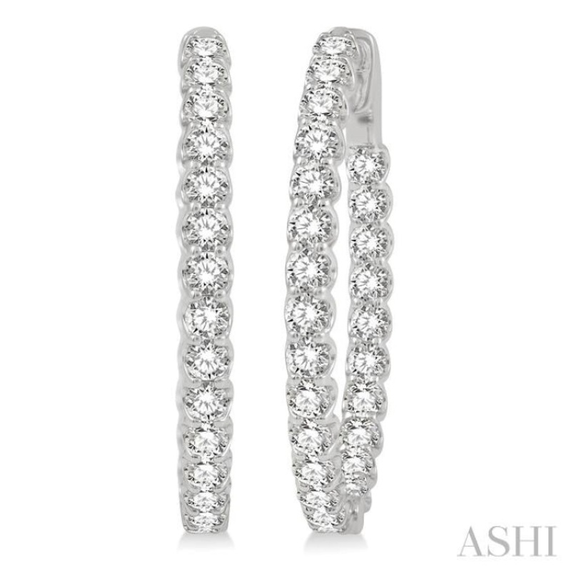 An awesome pair of diamond hoop earrings, these make a remarkable impression, with their sparkling layout of closely knit diamonds. They can be bought as a milestone anniversary gift. The hoop earrings feature a generous display of 25 each prong set round cut diamonds, a total of 50 diamonds on both earring. These diamonds are encrusted on the front curve and the visible inner arc of the hoop back, giving the earring an all-filling decorative look. The hoop earring is fashioned in 14 karat white gold. Total diamond weight is 4 ctw.