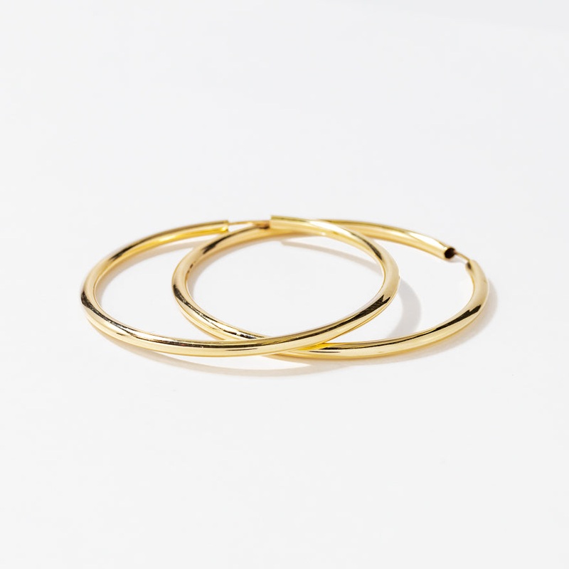 Add a touch of subtle allure and effortless elegance to your ensemble with these irresistible earrings. Crafted from 10K yellow gold, they boast a diameter of 40mm and 2mm in width, ensuring a captivating presence with every wear.
