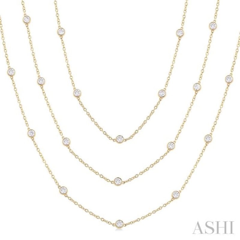 Indulge in luxury with this glamorous diamond long station necklace, which is a grand addition to your jewelry collection. Versatile and stylish, the necklace can be worn in multiple ways. Whether worn as a single long chain for a sleek and sophisticated look or twisted into layers for added volume and dimension, it effortlessly elevates any ensemble. The necklace features a stunning layout of 50 bezel set round cut diamonds adorning the stations of the 60-inch long Cat-30 Chain, creating an eye-catching effect. A polished finish 14 karat yellow gold body adds a touch of refinement and elegance. Total diamond weight is 5 ctw.