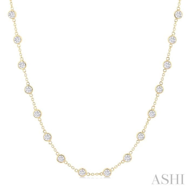 Indulge in the allure of understated luxury, with this bezel set diamond necklace, a radiant testament to elegance and sophistication. It features an embellishment of a round cut diamond each at every station along the neckline. There is a total of 32 round cut diamonds, each securely nestled in their individual bezel setting. The warm tones of yellow gold in the 18-inch cat station chain, provides a lustrous backdrop to this timeless necklace that effortlessly elevates any look. The diamond station necklace is fashioned in a polished finish 14 karat yellow gold. Total diamond weight is 5 ctw.