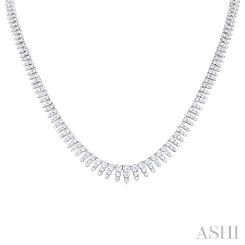 Embrace the allure of diamonds and elevate your look with this breathtaking necklace that radiates brilliance and luxury, capturing admiration with every sparkle. It is a statement accessory that effortlessly enhances any attire, making it perfect for special occasions and memorable moments. The opulent necklace showcases a total of 285 prong set round cut diamonds, meticulously arranged in a graduated spikes-shaped row of 3 each diamonds, along the neckline. Crafted in luxurious rhodium finish 14 karat white gold, this diamond riviera necklace exudes magnificence and sophistication. Total diamond weight is 5 ctw.