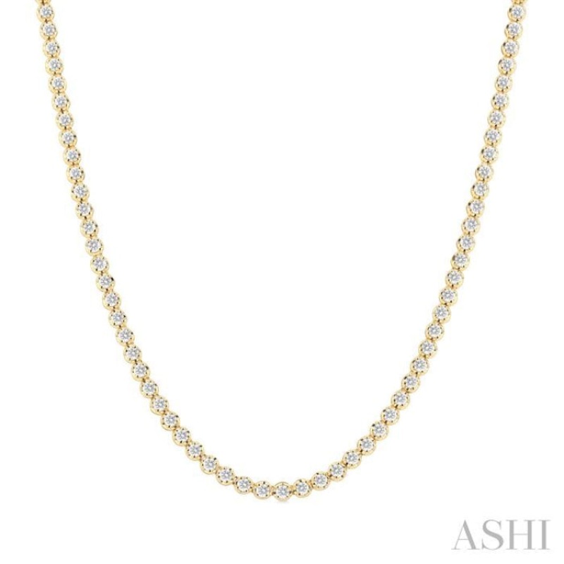 A fabulous illusion diamond eternity tennis necklace, this offers grandeur and appeal. It features a close-knit row of round cut diamonds that line the necklace end to end, which is why it is called an eternity necklace. There is a total of 138 prong set round cut diamonds embellishing the necklace, creating an illusion of sparkling light. The eternity diamond tennis necklace is designed in a 14 karat yellow gold. Total diamond weight is 5 ctw.