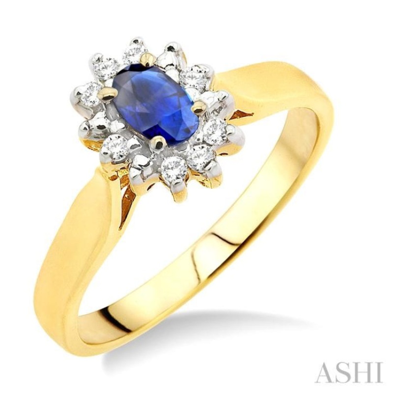 Simple beauty at your beloved fingers! The center of this slender shiny 14 karat yellow gold ring blazes with a stunning oval cut Sapphire, beautifully haloed by 8 magnificent round cut diamonds, perfectly prong set. Total diamond weight is 1/10 Ctw and oval cut Sapphire measures 5x3mm.
