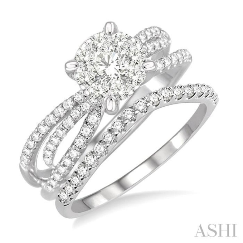 Let this scintillating diamond lovebright wedding set be a true and sparkling symbol of your marriage commitment. Styled in 14 karat shining white gold the engagement ring showcases a set of 9 invisible set round cut diamonds at the center accented by 56 s