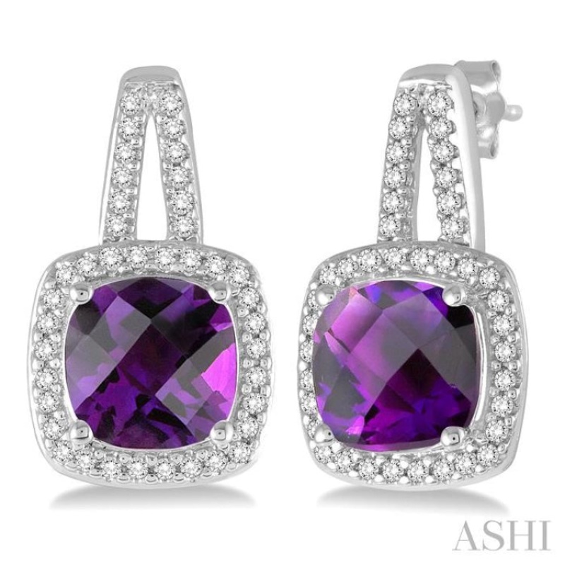 Elegance in style with these chic Amethyst and diamond earrings. Crafted in cool 10 karat white gold, these style features a centrally staged cushion shape Amethyst bordered with a squared frame of shimmering 80 prong set round cut diamonds. These treats close with secure clasp. Total diamond weight is 1/4 ctw and each Amethyst measures 7×7 MM.