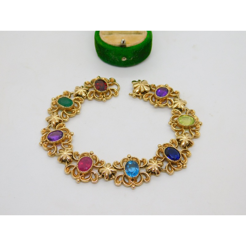 Details: A fantastic and wonderfully designed vintage 9ct yellow gold floral panel bracelet with superb detailing throughout, each panel set with differing stone in acrostic style to include garnet, emerald, amethyst, ruby, imperial topaz, sapphire & peridot; all tested and the bracelet is hallmarked Birmingham c1990 to the bale. A beautiful colourful example. This is a wonderful item that would make a perfect gift or addition to any collection. The BOX pictured is for PRESENTATION ONLY and is NOT included in the listings but used to frame the pictures unless specifically stated otherwise.