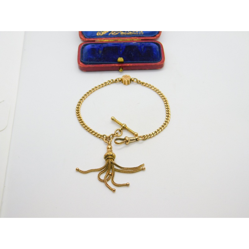 Fantastic antique 9ct yellow gold ladies Albertina watch chain which could be worn as a bracelet dating from the mid Victorian period. There is a pretty engraved central detail, a T bar and a tassel charm or pendant. The tassel has one end ball missing please see the pictures. To the end is a secure dog clip clasp with a good spring. The gold is marked to the side of the dog clip as well as a tag to the end of the chain. Wonderful quality.Length 23.0 cm or 9.0 inches.
