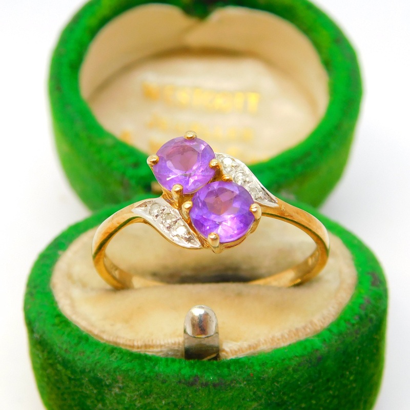 Details: A fantastic and wonderfully designed vintage 9ct yellow gold crossover tor et moi dress ring set with amethysts flanked with small diamonds hallmarked to the interior c1970. This is a wonderful item that would make a perfect gift or addition to an