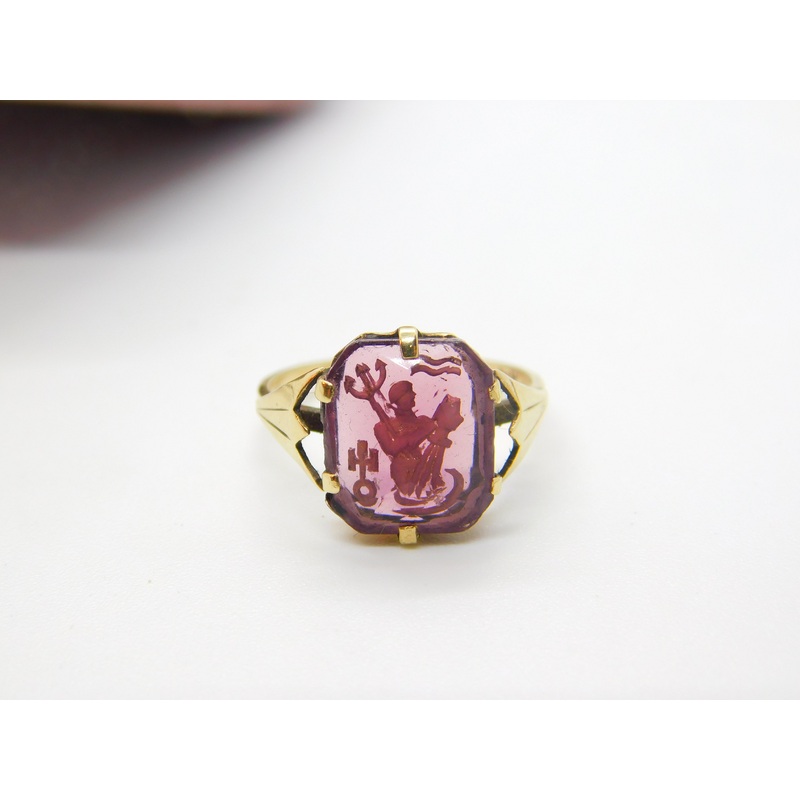 Details: A fantastic and wonderfully designed antique art deco 9ct yellow gold ring set with a lovely reverse carved purple glass intaglio depicting neptune marked 9ct to the interior c1920. This is a wonderful item that would make a perfect gift or additi