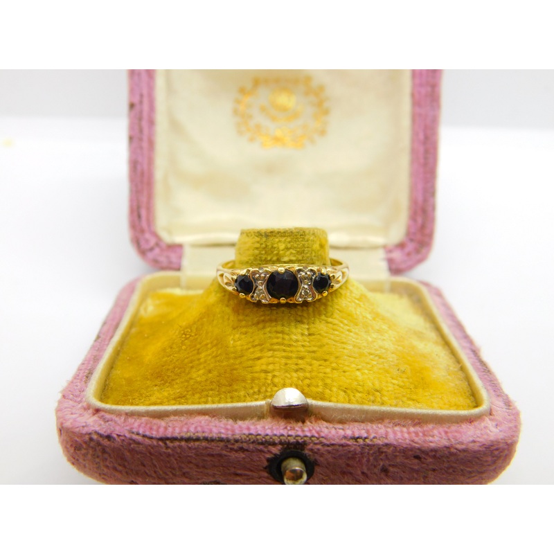 Details: A fantastic and wonderfully designed vintage 9ct yellow gold victorian style boat ring set with natural sapphire & diamonds hallmarked Birmingham 1982 to the interior band by Georg Jensen Ltd. This is a wonderful item that would make a perfect gift or addition to any collection. The BOX pictured is for PRESENTATION ONLY and is NOT included in the listings but used to frame the pictures unless specifically stated otherwise.