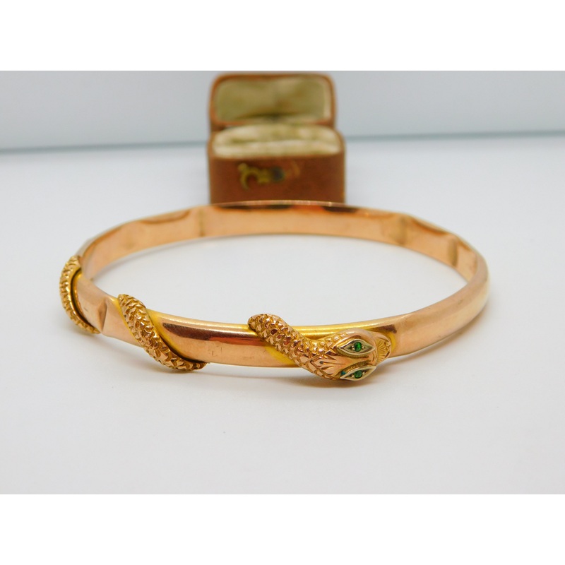 Details: A fantastic and wonderfully designed antique art deco 9ct rose gold slave or cuff bangle adorned with a superb interwoven snake or serpent set with green eyes hallmarked Birmingham 1922 by Payton, Pepper & Sons Ltd. Minor dents to a couple of area