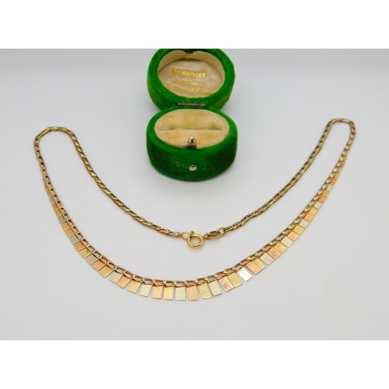 Details: A fantastic and wonderfully designed vintage 9ct tri-colour gold shimmering dress necklace with lovely detailing hallmarked London 1994 to the bale. This is a wonderful item that would make a perfect gift or addition to any collection. The BOX pic