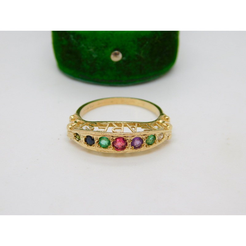 Details: A fantastic and wonderfully designed vintage 9ct yellow gold acrostic ring spelling with the set stones the word 'Dearest' hallmarked Birmingham c1990. D - Diamond, E - Emerald, A - Amethyst, R - Ruby, E - Emerald, S - Sapphire, T - Tourmaline. Al