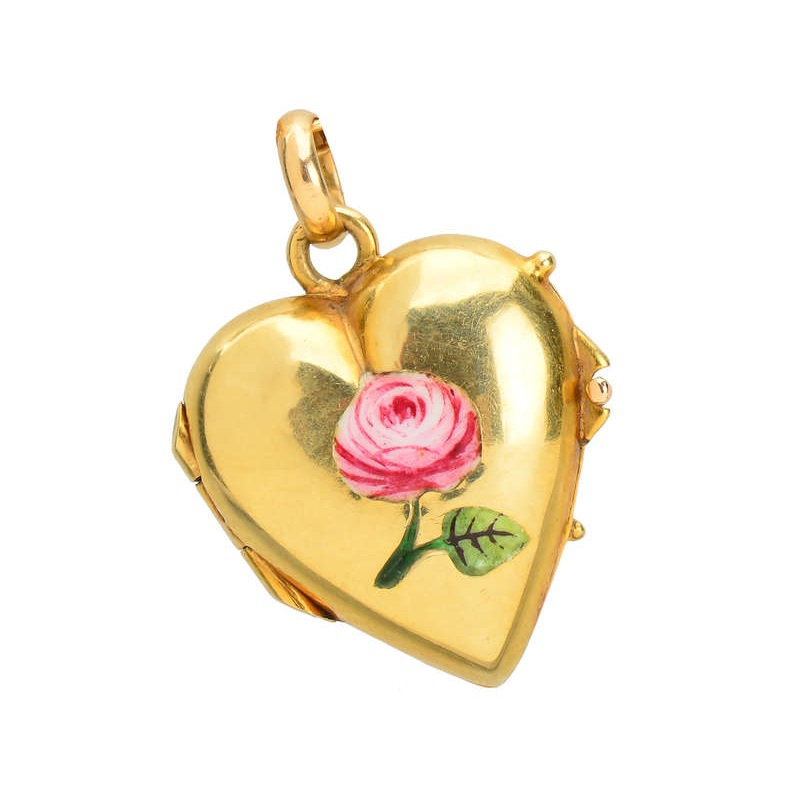 It is said you should always keep a smile in your heart, but a rose may be just as soothing. Petite and utterly charming, this puffy little heart locket can hold two tiny photographs. It is created in 15k yellow gold, and is an antique dating to circa 1900