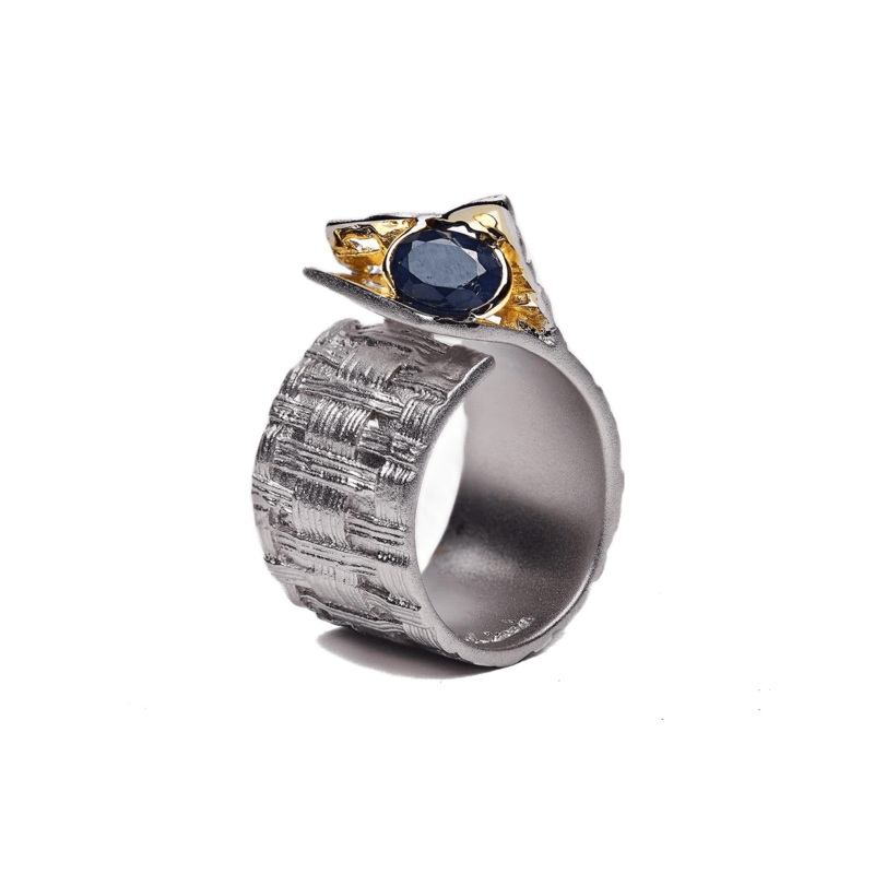 Lines of natural lattice etching caress the surface of this silver Accalia Ring plated with white rhodium. It speaks of ancient beauty with its central blue sapphire. The jewel is nestled within a setting of gold which makes it all the more striking. When