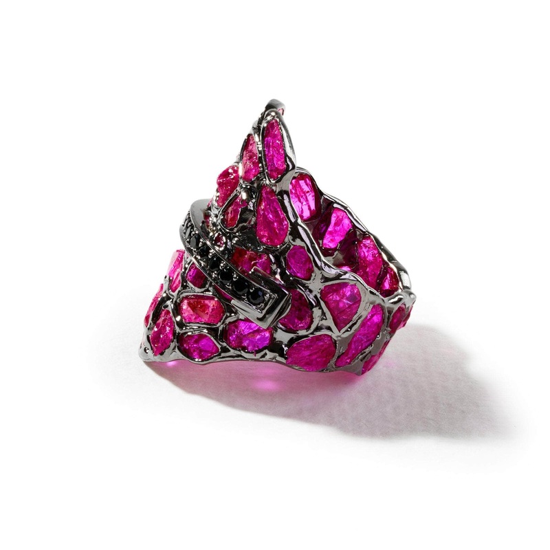 Introducing a ring born of pure innovation, crafted through 's pioneering "stained glass" technology for rough gemstone setting. This piece weaves untamed rough ruby crystals together like a puzzle, forming a kaleidoscope of natural beauty. Across its surf