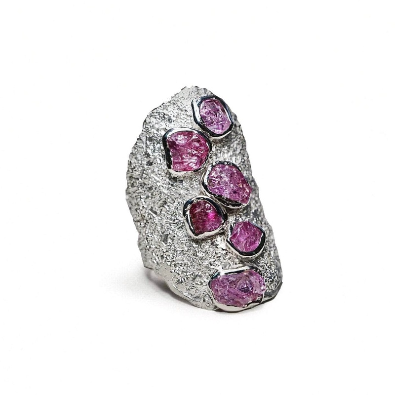 Emerging from the surface of this ring are a series of glistening rough pink sapphires. Their raw quality shines forth like a beacon of loveliness. The ring is marked with texture and personality as it is handcrafted with the greatest of care by the most skilled artisans.