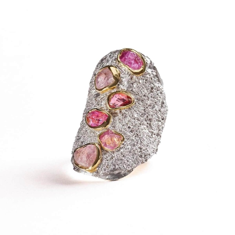 This large striking barrel shaped ring with a lustrous and textured surface is both captivating and memorable. With five bold rough spinel gemstones of varing bright colors it shows a defiance and uniqueness to traditional beauty. Each are trimmed with a line of delicate gold which sparkles provocatively in the light.