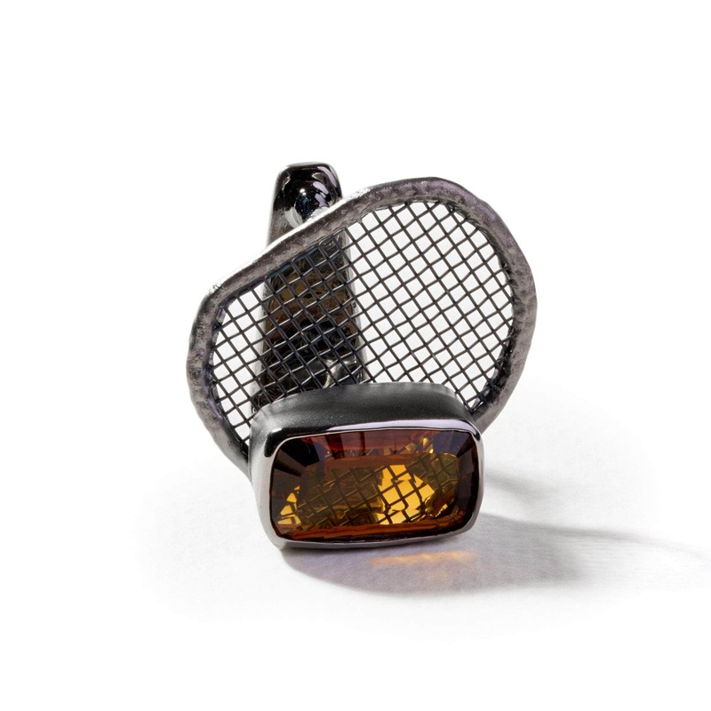 Crafted from a peculiar combination of silver and titanium mesh, this designer silver ring tickles the imagination. Light and warm, this contemporary piece can be a testament to the limitless nature of artistic expression. An octagon-cut smoky quartz takes central stage with its enigmatic charm emphasized by a little dot of yellow sapphire. This singular wearable art with an uncommon square open band is a gentle reminder that in the world of creativity, boundaries cease to exist.