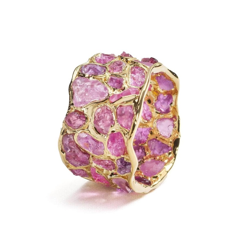 A barrel ring encrusted with brilliantly sparkling gemstones that have a truly opulent glow. They are encased in a setting of pure gold that is truly radiant in its shine and lusture.Metal: 925 SilverStones: Ruby RoughPlating: 18K GoldWidth 11 mmBand wide