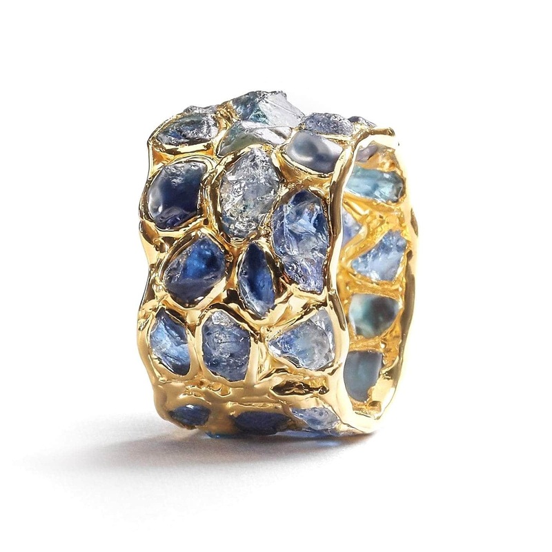 A barrel ring encrusted with brilliantly sparkling gemstones that have a truly opulent glow. They are encased in a setting of pure gold that is truly radiant in its shine and luster.Metal: 925 SilverStones: Rough SapphirePlating: 18K GoldWidth 11 mmLength