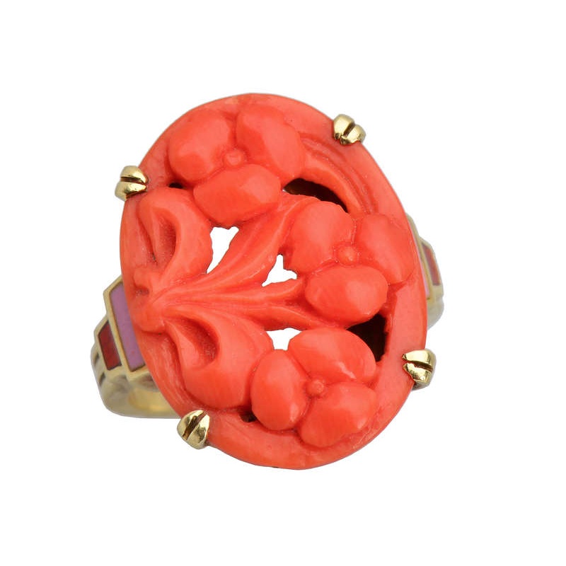 From the maker of Allsopp Brothers, formerly active in Newark, N.J., and active from the beginning and early part of the 1900s, comes this carved coral, enamel and gold ring.