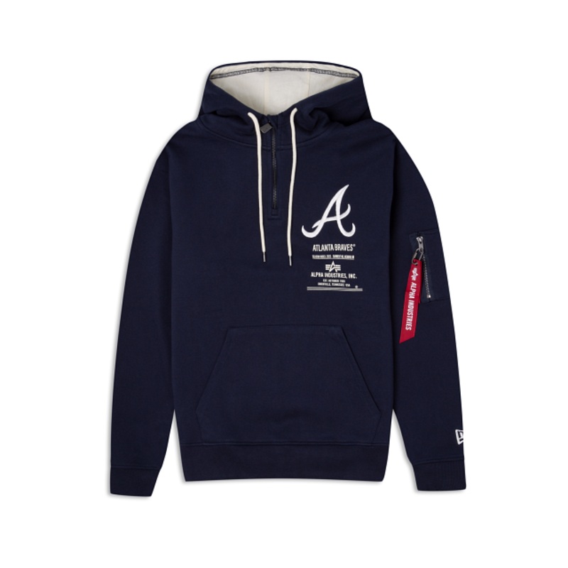 The Alpha Industries X Atlanta Braves Zipper Hoodie features screen-printed Alpha Industries and Braves logos at the front with a team wordmark at the rear. Additional details include a utility pocket with the Alpha Industries ribbon at the left sleeve and a three-quarter zipper closure.
