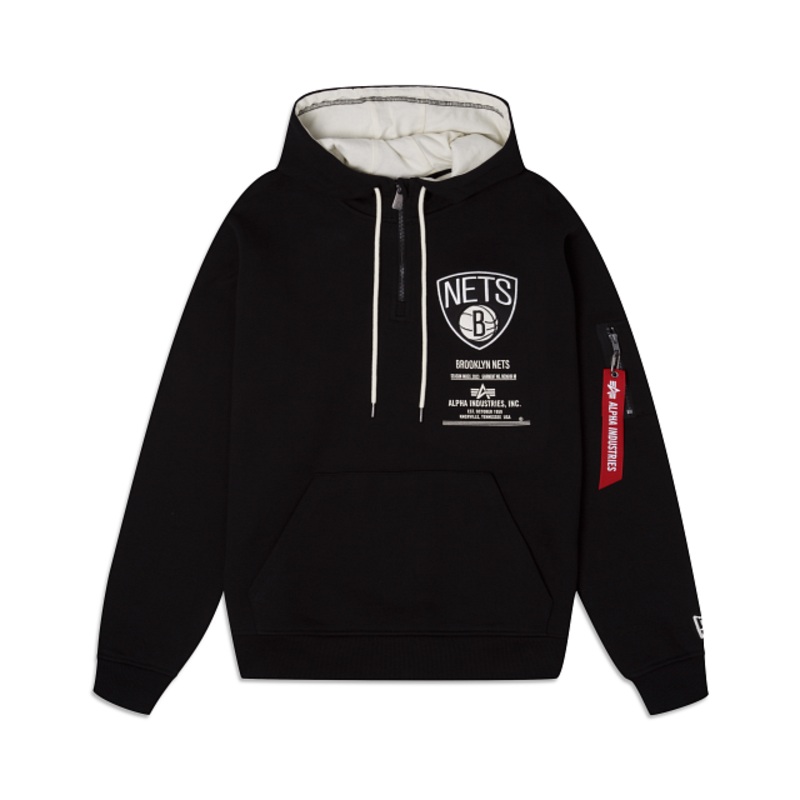 The Alpha Industries X Brooklyn Nets Zipper Hoodie features a screen-printedAlpha Industries logo and an embroidered Nets logo at the front with an embroidered applique team wordmark at the rear. Additional details include a utility pocket with the Alpha Industries ribbon at the left sleeve and a three-quarter zipper closure.