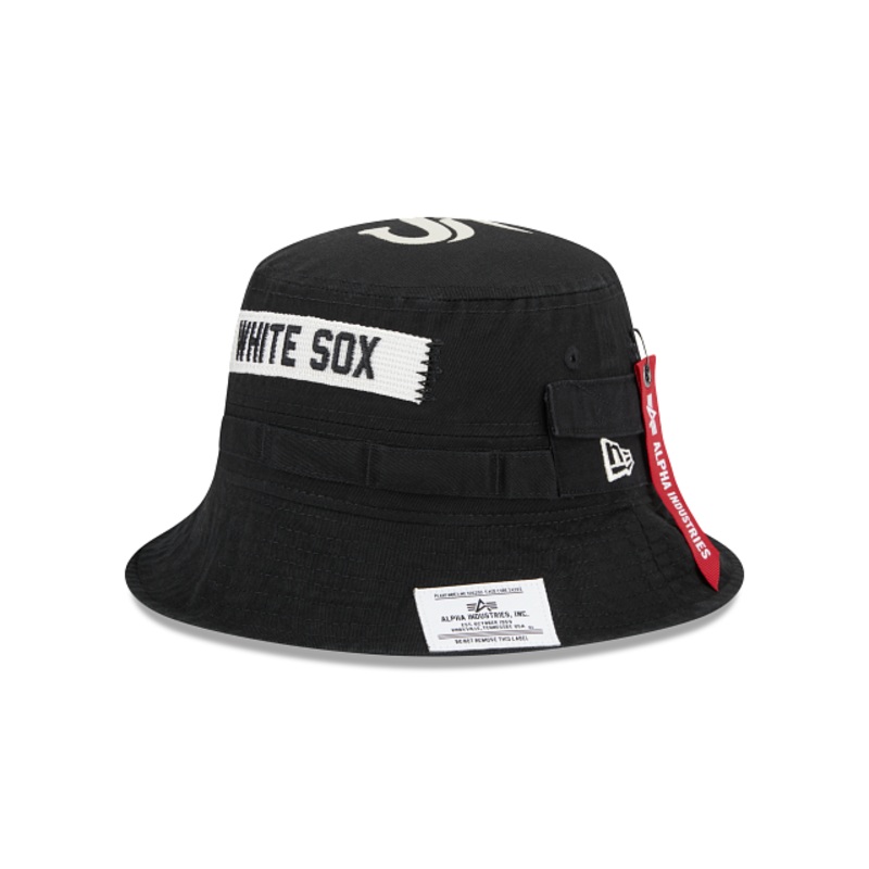 The Alpha Industries X Chicago White Sox Adventure Bucket features an embroidered White Sox wordmark at the front panel with an Alpha Industries tag and signature red ribbon at the left-wear side. Additional details include a team logo at the top panel.