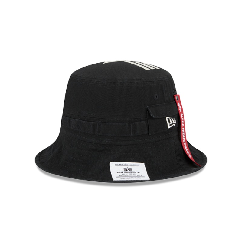 The Alpha Industries X New Era Adventure Bucket features an embroidered Alpha Industries tag and ribbon at the left-wear side with a screen-printed Alpha Industries logo at the top panel.