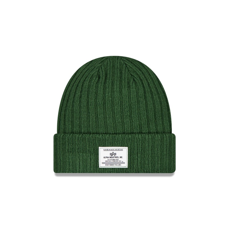 The Alpha Industries x New Era Green Cuff Knit features a woven Alpha Industries, Inc. label at the front with an embroidered New Era Flag at the left-wear side.