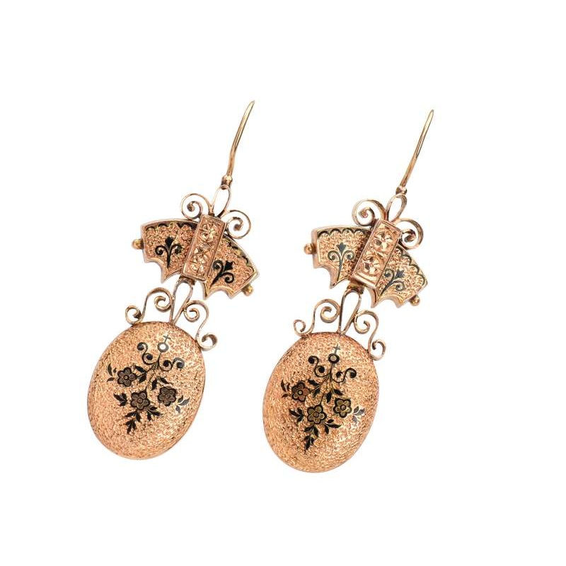 Floral themed and created in two parts, these antique earrings blend pale rose gold, fine black enamel, curlicues and scrolls of more gold.