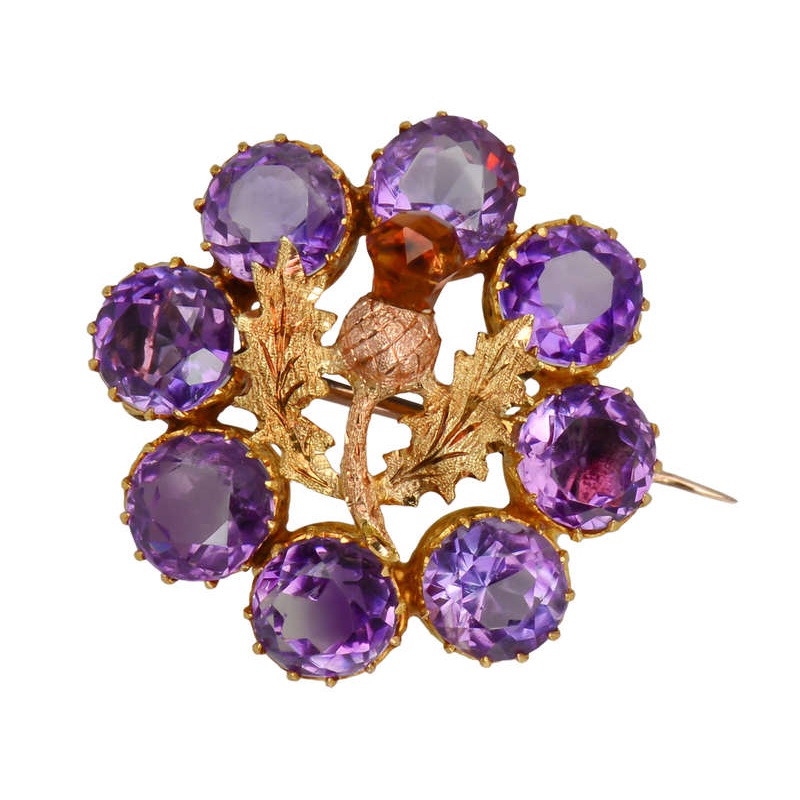 Eight intense and shimmery amethysts weigh a total of 8.0 carats. Each is set into a decorative coronet mount. A Scottish thistle of gold is centermost and topped with a faceted citrine.
