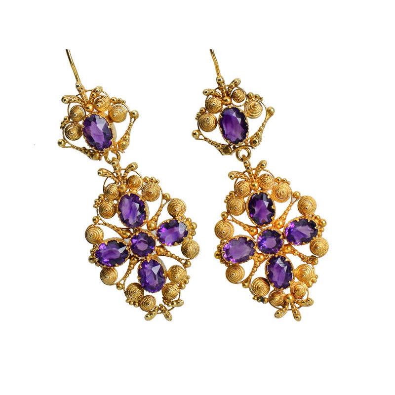 These are very fine examples and with a versatile length. Constructed in two parts, there are 6 faceted amethysts in each earring, a total of 12 in all. Their glittering royal purple of 4.5 carats in total plays counterpoint to the bright 18k yellow gold spirals, beehives, tendrils and tiny spheres.