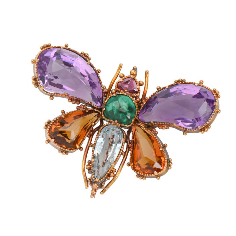 Amethysts and citrines comprise the wings. An aquamarine, a swirled malachite cabochon and a pink-hued garnet form the body.