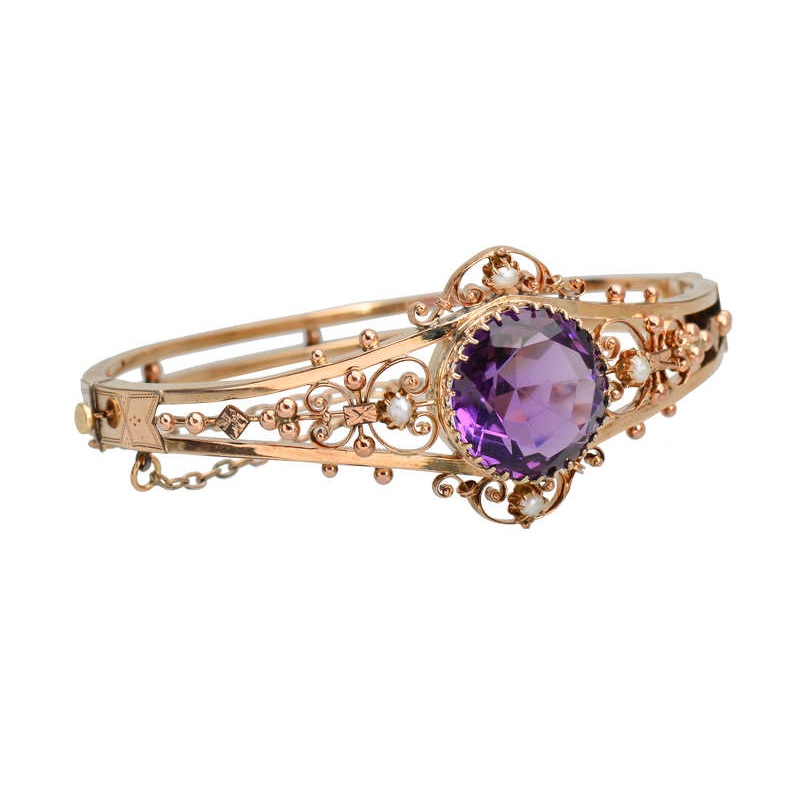 In its original box, this antique bangle bracelet is an amazing find!Created with a large natural amethyst, 4 natural freshwater seed pearls and in an ornate rose gold filled setting, the same bracelet in solid gold would cost thousands of dollars. Dating