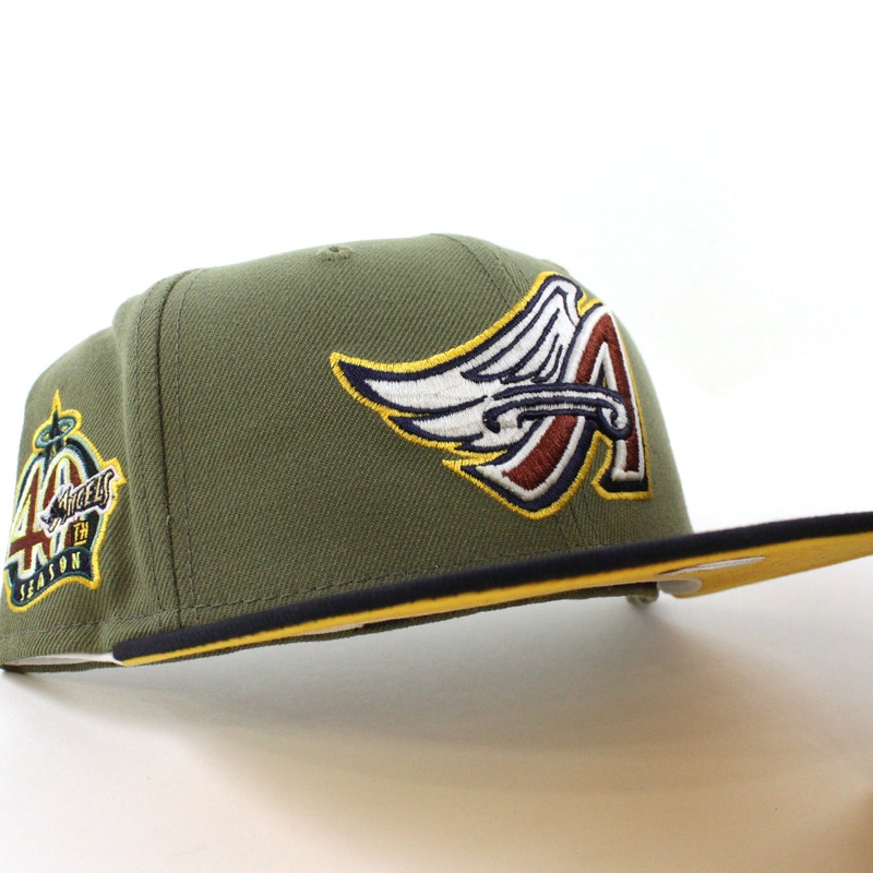 Anaheim Angels 40Th Season New Era 59Fifty Fitted Cap in Green Bark, Navy, and Grilled Yellow Under Brim.