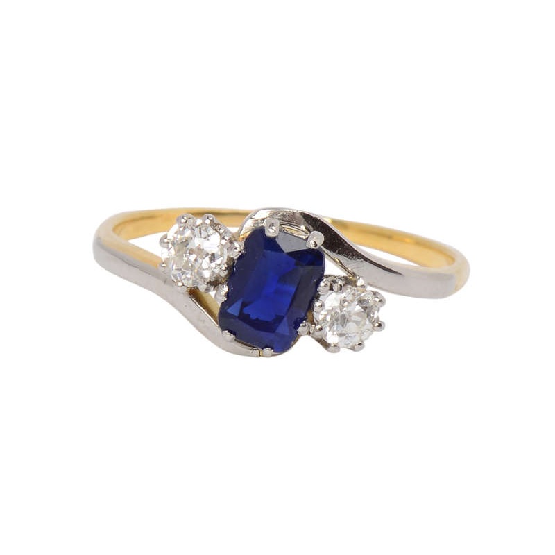 Three stones align on the diagonal, royal blue for the sapphire and white and glittering for the diamonds.