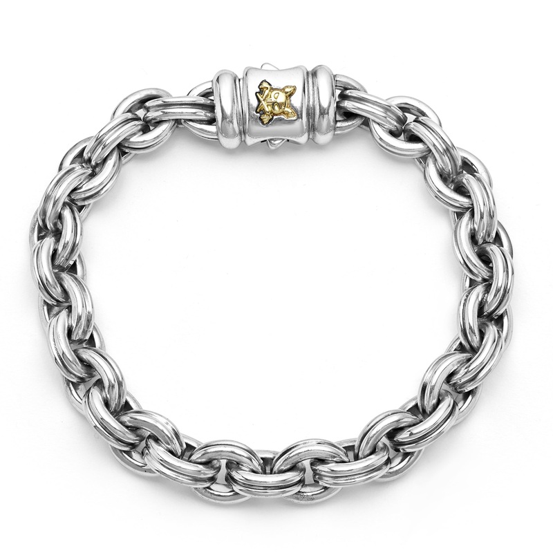 Sterling silver links form this bold double link chain bracelet finished with a krunch crescent on the clasp.Sterling Silver & 18K GoldTwo Presser Clasp9.5mm Double Cable ChainSize Medium measures 7.5 to 7.75 inchesStyle #: 05-81555-7