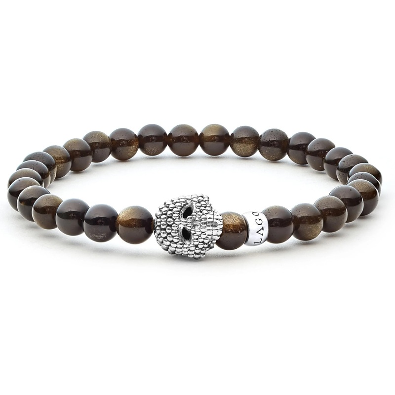 Golden obsidian gemstone beaded bracelet with a sterling silver Caviar skull.Sterling SilverSlip On StyleGemstone Dimension 6mmStretch fit accommodates most wrist sizesGemstones are natural with unique hues and colors may vary from the image shownStyle #: