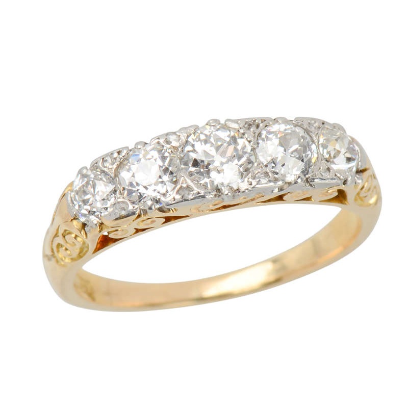 Five old European cut diamonds nestled together gracefully curve over the finger in this versatile Edwardian era ring.